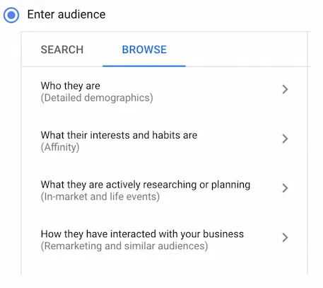 For audience, advertisers can choose between who the user is, what they’re interested in, what they’re actively searching or planning, and how they’ve interacted with your business.