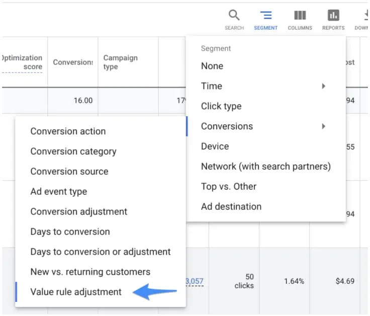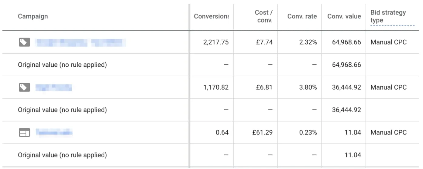 After doing this, you’ll see a new segment for “original value (no rule applied) for any account or campaign that has a non-zero conversion value.