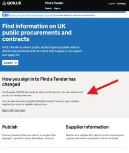 1. In the pale grey block (second panel on the page under the black static header), it states “How you sign in to Find a Tender has changed” and provides a link to “Sign in with One Login” (see red arrow below).