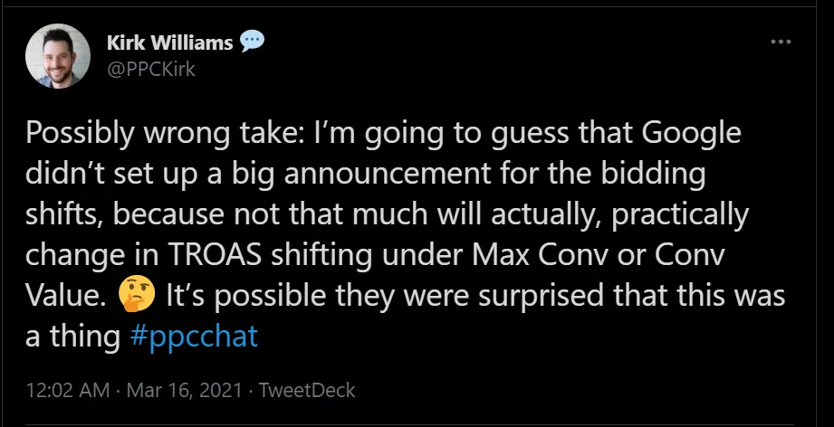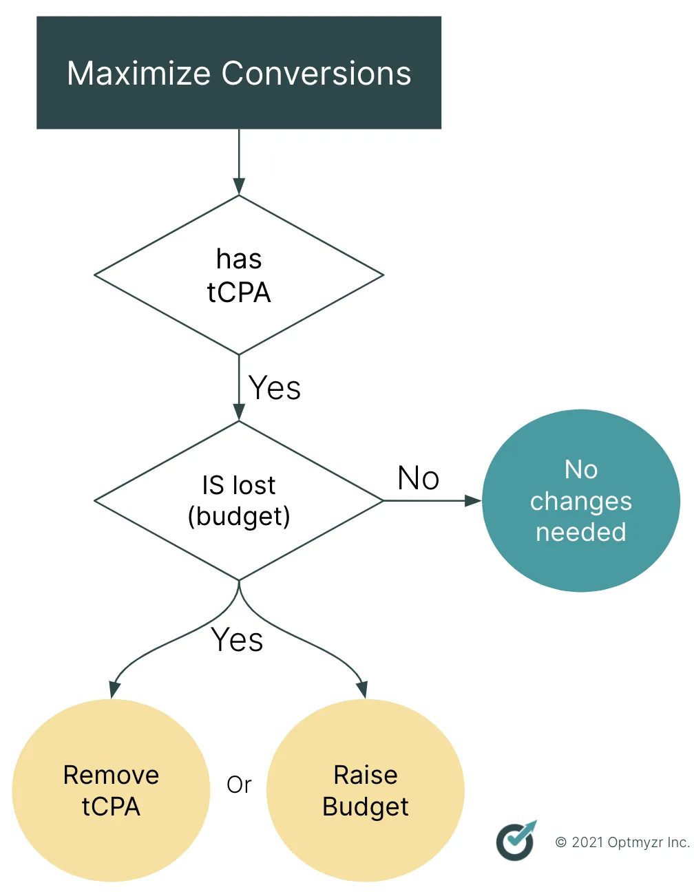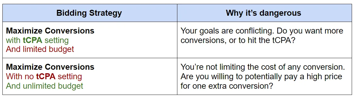 In the past, Google recommended that advertisers with the old tCPA strategy and a constrained budget either remove the budget constraint (by increasing the budget), or switch to the old Maximize Conversions strategy. This obviously won’t work when tCPA and Maximize Conversions are merged and become the same.