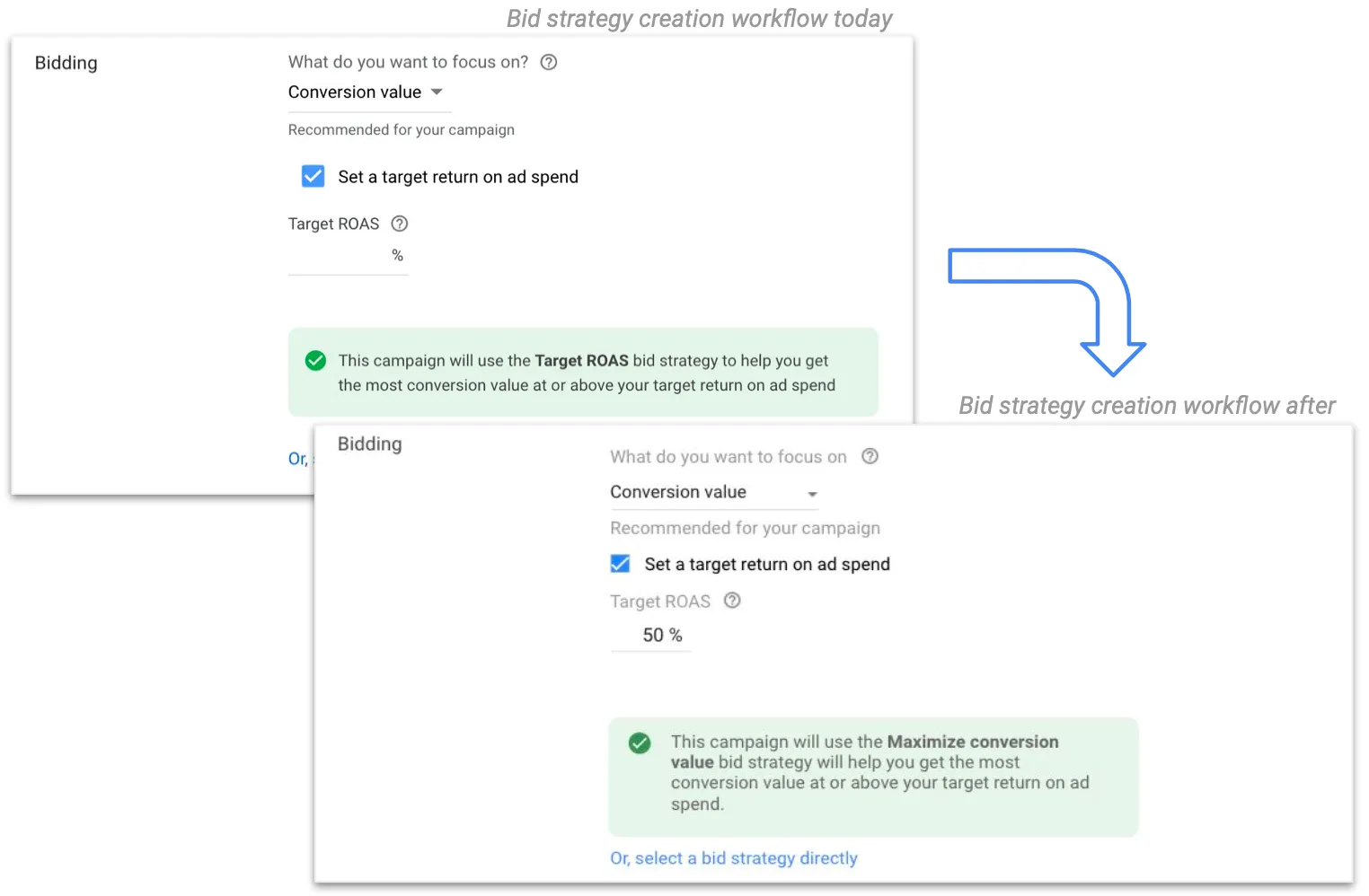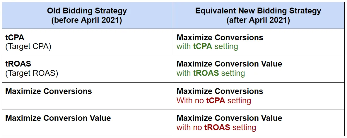 Starting from April 2021, advertisers will not be able to create outright tROAS or tCPA bid strategies. Instead, there will be two new fields: one to add a target CPA for the ‘Maximize Conversions’ strategy, and another for target ROAS for the ‘Maximize Conversion Value’ strategy.